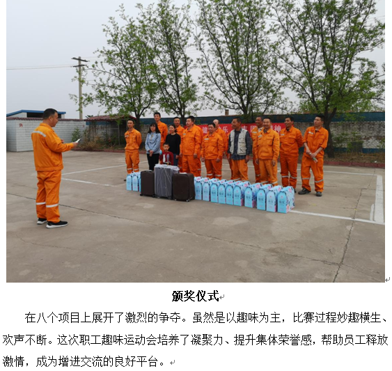 2019職工趣味運動會 為進一步增強職工們的身體素質,豐富文體生活,增強凝聚力,在“五四”青年節(jié)來臨之際兗州文水分公司、呂梁分公司、中材文水分公司精心籌備,周密策劃的職工趣味運動會,在兗州文水分公司生活區(qū)如期舉行。本次運動會的主題是“以促進友誼為主,貴在人人參與,活躍公司氣氛”。以青年員工為主20多名干部職工參加了本次運動會。通過自娛自樂這種形式,增強團隊合作精神,培養(yǎng)職工熱愛運動,促進身體健康,增強公司凝聚力、戰(zhàn)斗力、號召力的目的。5月6日下午,三個分公司的職工趣味運動會,在經理王建立宣讀比賽規(guī)則后拉開了帷幕。此次活動由辦公室人員組織策劃,得到公司大力支持與全體員工的積極配合和參與。本次運動會共設有八個比賽項目: