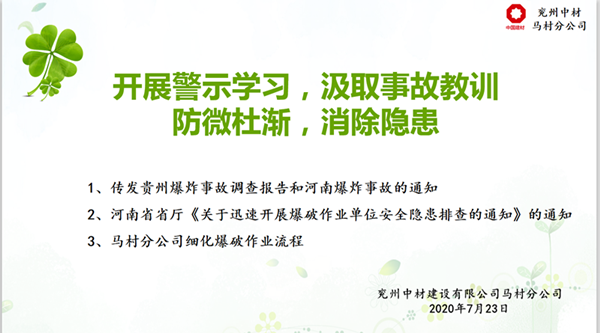 馬村分公司于7月23日下午在會議室舉行了“開展警示學(xué)習(xí),汲取事故教訓(xùn),牢筑安全防線”的會議,會議為大家轉(zhuǎn)發(fā)了《貴州凱里市舟溪鎮(zhèn)“3.19”較大爆炸事故調(diào)查報(bào)告》及河南欒川縣爆炸事故有關(guān)情況、河南省省廳《關(guān)于迅速開展爆破作業(yè)單位安全隱患排查的通知》。同時(shí)為了認(rèn)真貫徹“安全第一、預(yù)防為主”的方針,切實(shí)做好現(xiàn)場安全爆破作業(yè),并規(guī)范管理使用民用爆炸物品的工作,從根本上消除爆破安全隱患,杜絕爆破事故的發(fā)生,實(shí)現(xiàn)安全生產(chǎn),馬村分公司參會人員學(xué)習(xí)爆破作業(yè)安全規(guī)程的相關(guān)知識。 學(xué)習(xí)完調(diào)查事故報(bào)告及相關(guān)通知后,分公司涉爆人員紛紛根據(jù)自身工作情況結(jié)合學(xué)習(xí)內(nèi)容積極展開自查自糾活動,其中結(jié)合分公司公司實(shí)際,管理人員提出以下問題: 分公司執(zhí)行經(jīng)理劉黨提出:一是現(xiàn)場涉爆人員在卸載炸藥時(shí),要輕拿輕放,避免炸藥和地面石塊等發(fā)生碰撞,產(chǎn)生火花發(fā)生殉爆;二是在制作起爆器材時(shí),用木棍先在乳化炸藥包裝上扎眼,再插入電子雷管,禁止用金屬物件,以免發(fā)生安全隱患。 經(jīng)理助理曲光澤提出:一是在民爆物品審批時(shí),一定要按照打孔孔數(shù)申報(bào),提前規(guī)劃、計(jì)算好需要的數(shù)量,防止數(shù)量過多,以免后續(xù)存在安全隱患;二是有爆破作業(yè)時(shí),一定按照河南省公安下發(fā)的通知,爆破工程技術(shù)人員、爆破員(2人)、安全員及保管員(2人)及時(shí)到位,履行各自的職責(zé),并及時(shí)拍照上傳給公安機(jī)關(guān)。 安全員王建平提出:爆破現(xiàn)場要及時(shí)做好安全警戒,用警戒繩劃出爆破范圍;并且爆破作業(yè)區(qū)域內(nèi)禁止吸煙、攜帶打火機(jī),并要求現(xiàn)場人員相互監(jiān)督,及時(shí)制止不安全行為,消除一切安全隱患。 最后由項(xiàng)目經(jīng)理李文軍做最后總結(jié),先是通過對貴州凱里市舟溪鎮(zhèn)“3.19”較大爆炸事故調(diào)查報(bào)告的學(xué)習(xí),大家要學(xué)習(xí)“四不放過”原則,深刻汲取事故教訓(xùn),防微杜漸,消除隱患。并且著重強(qiáng)調(diào)安全無小事,尤其是涉及到爆破作業(yè),更要小心謹(jǐn)慎,時(shí)刻謹(jǐn)記“四不傷害”原則,保證自己的安全也要保證他人的安全。更要注意細(xì)節(jié),從民爆物品的審批開始,必須有申請單,根據(jù)炮孔總米數(shù)計(jì)算藥量,爆破工程技術(shù)人員審批后,才可以進(jìn)行民爆信息平臺的申請,后續(xù)的領(lǐng)用、發(fā)放,裝卸,裝藥、填塞,警戒,起爆,爆后檢查等一系列流程,都要保持著細(xì)心、小心、耐心的態(tài)度進(jìn)行各自的工作。同時(shí)要求分公司涉爆人員根據(jù)自己的崗位,細(xì)化流程,盡早擬定一份爆破作業(yè)流程,供分公司人員學(xué)習(xí)。