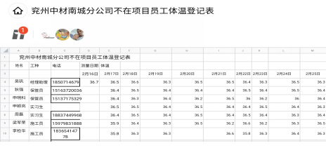 三、加強(qiáng)員工管理,落實(shí)檢查制度 分公司建立多種檢查制度,通過現(xiàn)場人員現(xiàn)場檢查、在項(xiàng)目隔離人員與未返工員工自查等多種形式進(jìn)行人員健康狀況監(jiān)測,并如實(shí)記錄,如有異常者及時(shí)送醫(yī)就診,做到“早發(fā)現(xiàn),早隔離,早上報(bào),早治療”,切斷傳播途徑,杜絕疫情蔓延。 1、現(xiàn)場人員檢查