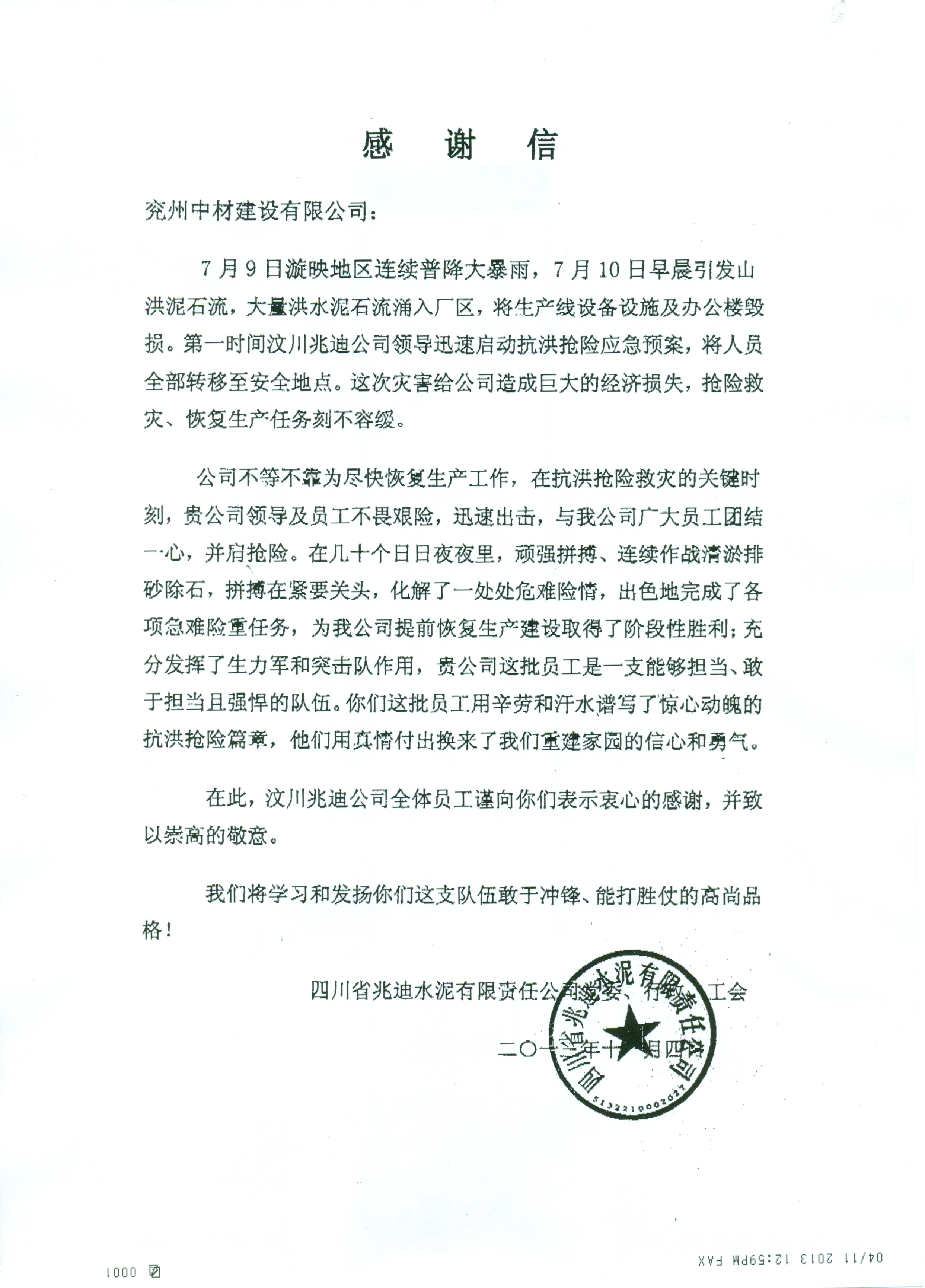 四川省兆迪水泥有限責(zé)任公司發(fā)來(lái)的感謝信!