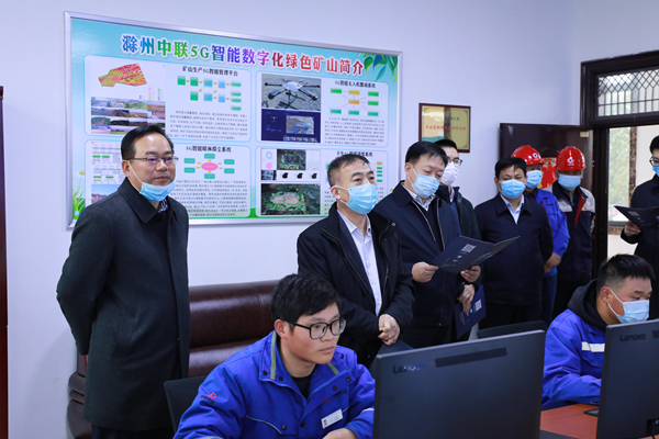 3月17日下午,中國建材股份有限公司黨委委員、副總裁、中材礦山建設(shè)有限公司董事長張金棟一行蒞臨滁州中聯(lián)黃槽坊礦山視察指導(dǎo)工作,滁州中聯(lián)水泥有限公司黨委書記、總經(jīng)理劉曉俊率黨委成員、兗州中材建設(shè)有限公司副總經(jīng)理顏景祥及相關(guān)領(lǐng)導(dǎo)全程陪同。  張總一行領(lǐng)導(dǎo)深入礦山現(xiàn)場,聽取了關(guān)于綠色礦山建設(shè)的相關(guān)匯報,實地檢查了礦山開采作業(yè)、車輛運輸、安全設(shè)備運行等相關(guān)情況。劉總向張總匯報了礦山開采近期規(guī)劃,并展望礦山未來發(fā)展。  隨后,張總一行參觀了5G智能控制室,聽取了關(guān)于5G智能數(shù)字化綠色礦山建設(shè)情況的相關(guān)匯報。  本次張總一行領(lǐng)導(dǎo)蒞臨黃槽坊礦山視察指導(dǎo),既肯定了現(xiàn)階段礦山建設(shè)取得的成績,又指明了礦山下階段的發(fā)展方向。