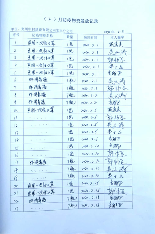 二、建立疫情防控領(lǐng)導(dǎo)小組,確保復(fù)工復(fù)產(chǎn)安全有序 分公司成立疫情防控領(lǐng)導(dǎo)小組,分公司經(jīng)理任組長(zhǎng),組員由已到崗的全體員工組成。領(lǐng)導(dǎo)小組嚴(yán)格按照當(dāng)?shù)卣螅瑖?yán)格落實(shí)疫情期間的消殺管控及登記制度,并與當(dāng)?shù)卮逦瘯?huì)合業(yè)主加強(qiáng)溝通,將感染風(fēng)險(xiǎn)降至最低。 三、多途徑購(gòu)買防疫物資,確保防疫物資供應(yīng) 寶豐分公司復(fù)工復(fù)產(chǎn)前,針對(duì)防疫物資緊缺的情況,一方面請(qǐng)求業(yè)主代為購(gòu)買防疫物資,另一方面請(qǐng)求總公司代為購(gòu)買。截止2月25日寶豐分公司已購(gòu)買口罩900個(gè),84消毒液90kg,防護(hù)服8套,護(hù)目鏡8套,酒精5kg,紅外線電子額溫槍1部,水銀體溫計(jì)10個(gè);防疫物資準(zhǔn)備充足,滿足1個(gè)月用量。  四、嚴(yán)格落實(shí)防控措施 (1)開展環(huán)境整治。對(duì)辦公場(chǎng)所及生產(chǎn)場(chǎng)所進(jìn)行衛(wèi)生清理;對(duì)空調(diào)進(jìn)行清理洗。 (2)滅菌殺毒。每日2次對(duì)辦公場(chǎng)所及生產(chǎn)場(chǎng)所進(jìn)行消毒處理,上午7:30至8:00,下午17:30至18:00。