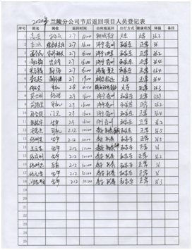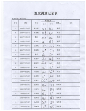 配合當(dāng)?shù)卣w溫監(jiān)測 落實措施,扎實開展防控工作。分公司設(shè)立疫情防控點,配備防護(hù)口罩、手套、防護(hù)鏡、體溫計及測溫槍、酒精、84消毒液、噴霧器等防護(hù)物資。嚴(yán)格控制返程人員,對居住或經(jīng)過疫情防控重點區(qū)域人員,要求暫不返回項目部,居家隔離自我觀察;要求返回項目部人員,返程路上嚴(yán)格落實個人防控措施,制定記錄表,對返回人員嚴(yán)格檢查、登記;返回項目部后,在項目部內(nèi)自行隔離14天,每天早晚測量體溫并做好記錄。    返程人員登記 每日體溫監(jiān)測 集中開展項目部衛(wèi)生消毒工作。分公司通過多種渠道,購進(jìn)酒精、84消毒液等藥品,每天上午下午各進(jìn)行一次集中消毒工作,辦公室、會議室、廚房、餐廳、宿舍、衛(wèi)生間、走廊、院內(nèi)邊邊角角,全面消殺。  項目部消毒 消毒記錄