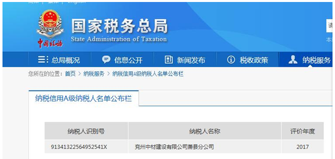 2018年6月15日,經(jīng)過在國家稅務(wù)總局官方網(wǎng)站查詢得知:兗州中材建設(shè)有限公司蕭縣分公司被評定為“A級納稅信用企業(yè)”。