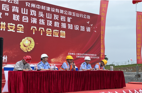 為深入宣貫黨的二十大精神和習(xí)近平總書記關(guān)于安全生產(chǎn)重要論述,進(jìn)一步樹牢“以人為本、安全發(fā)展”的安全生產(chǎn)管理理念,貫徹“安全第一、預(yù)防為主、綜合治理”的安全生產(chǎn)方針,強(qiáng)化非煤礦山事故應(yīng)急救援管理工作和應(yīng)急救援隊(duì)伍建設(shè),切實(shí)提高分公司應(yīng)對(duì)礦山突發(fā)事故的聯(lián)合應(yīng)急救援綜合能力,6月17日,兗州中材玉山分公司聯(lián)合江西玉山萬年青水泥有限公司、玉山縣藍(lán)天救援隊(duì)、玉山縣人民醫(yī)院等舉辦2023年“物體打擊事故”聯(lián)合演練及救援知識(shí)培訓(xùn)活動(dòng)。玉山縣應(yīng)急管理局局長(zhǎng)吳高峰、玉山萬年青水泥有限公司總經(jīng)理李躍華等出席本次活動(dòng)并致辭。
