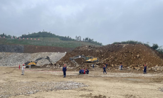 演練現(xiàn)場模擬遇強降雨后邊坡發(fā)生垮塌事故,在接到險情報告后,應急指揮部立即啟動應急預案,組織各救援小組趕赴現(xiàn)場