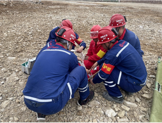 受傷人員救出后,醫(yī)療救護組進入現(xiàn)場,通過傷情檢查,發(fā)現(xiàn)傷員腿部受傷,立即對傷員進行救治