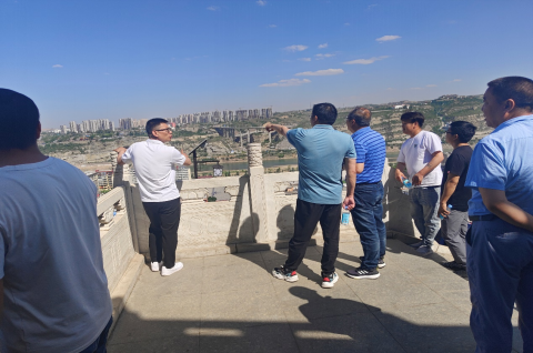 來到觀景臺邊,大家回望著來時的路,它就在腳下,不由得心懷感激,內(nèi)心充滿著自豪感。向遠處眺望,奔騰的黃河在拐過大“幾”字彎沖出晉陜蒙峽谷后,進入晉陜兩省交界處變得特別溫順,母親河的水也變得特別清澈,該段也是黃河唯一一段自東向西的流向,看著奔流不息的黃河水,寓意著中華文明源遠流長,偉大的中國共產(chǎn)黨生生不息!